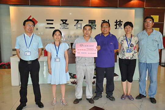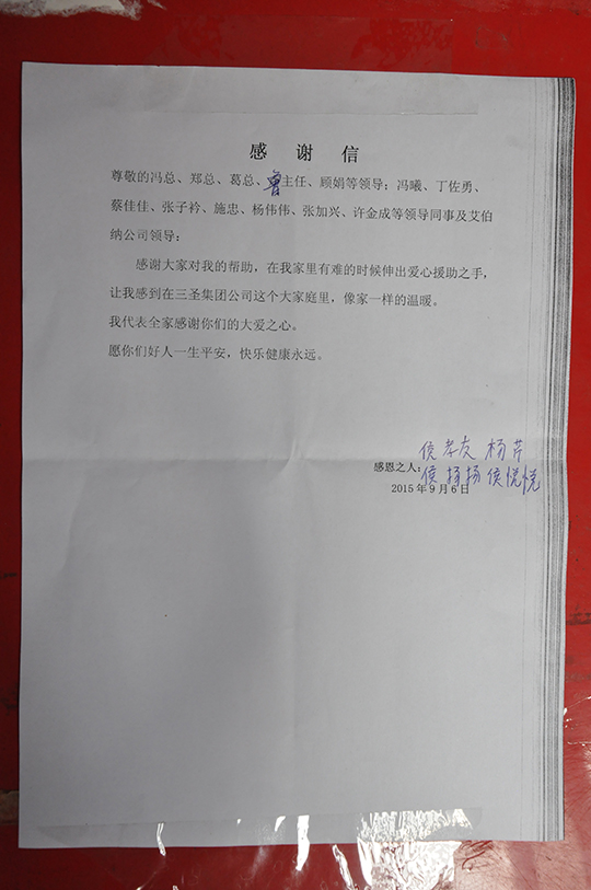 四、 董事長親自捐贈善款救助聽到侯孝友的實際困難匯報后,董事長非常關(guān)心,立即拿出私人款2000元現(xiàn)金資助,幫助侯孝友度過暫時的難關(guān)。鄭董還親自接待了侯孝友,詳細了解了他家庭目前的狀況,鼓勵他樹立信心,克服暫時困難,及時幫助妻子治療,引導(dǎo)兒女安心學(xué)習(xí),同時,希望他在公司本職工作中繼續(xù)發(fā)揚不拍苦、腳踏實地的精神,積極專研技能,不要辜負三圣愛心傳遞的希望。