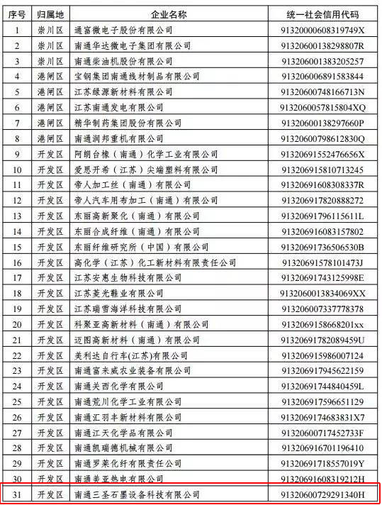 6月2日上午,南通市環(huán)保局公布了關(guān)于2016年度南通市區(qū)非國(guó)控企業(yè)環(huán)境信用等級(jí)評(píng)定結(jié)果的通知,經(jīng)對(duì)南通市區(qū)406 家非國(guó)控企業(yè)2016 年度環(huán)境信用進(jìn)行評(píng)審,確定南通三圣石墨設(shè)備科技股份有限公司等50家單位為綠色企業(yè)。
