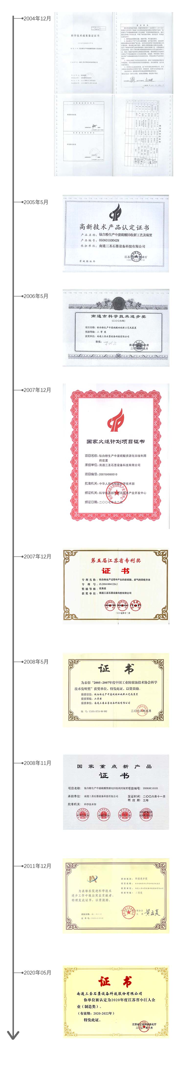 南通三圣該項(xiàng)技術(shù)先后得到了政府諸多部門的高度評價(jià)。2004年12月,“鈦白粉生產(chǎn)中廢硫酸回收新工藝及裝置”通過江蘇省科技廳組織的科技成果鑒定,鑒定意見指出,該項(xiàng)成果填補(bǔ)了國內(nèi)鈦白粉產(chǎn)業(yè)廢硫酸回收技術(shù)及裝備的空白,總體水平達(dá)到國際先進(jìn)。2005年5月,該項(xiàng)成果被認(rèn)定為江蘇省高新技術(shù)產(chǎn)品。2006年5月,該項(xiàng)成果榮獲南通市科技進(jìn)步二等獎(jiǎng)。2007年12月,“鈦白粉生產(chǎn)中廢硫酸資源化回收利用的裝置”被科技部列為國家火炬計(jì)劃項(xiàng)目。2007年12月,“鈦白粉生產(chǎn)過程中產(chǎn)生的廢硫酸、廢氣的回收方法”榮獲江蘇省優(yōu)秀專利獎(jiǎng)。2008年5月,“鈦白粉生產(chǎn)中廢硫酸回收新工藝及裝置”榮獲中國工業(yè)防腐蝕技術(shù)協(xié)會(huì)技術(shù)發(fā)明二等獎(jiǎng)。2008年11月,“鈦白粉生產(chǎn)中廢硫酸資源化回收利用裝置”被科技部、環(huán)保部、商務(wù)部、國家質(zhì)檢總局認(rèn)定為國家重點(diǎn)新產(chǎn)品。2011年12月,“鈦白廢酸資源化節(jié)能回收系統(tǒng)裝置”榮獲中華全國工商業(yè)聯(lián)合會(huì)科技進(jìn)步二等獎(jiǎng)。2020年,公司以工業(yè)廢副硫酸低能耗蒸發(fā)濃縮與資源化回收成套裝備產(chǎn)品獲得江蘇省專精特新小巨人企業(yè)榮譽(yù)稱號。