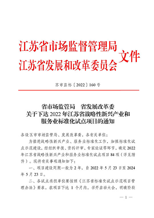 江蘇省戰(zhàn)略性新興產(chǎn)業(yè)標準化試點項目由省市場監(jiān)督管理局和省發(fā)展和改革委員會共同組織。項目對申報單位有著明確的要求:市場占有率和經(jīng)濟效益排名位于本地區(qū)同行業(yè)前列,具有良好的發(fā)展?jié)摿?,具備統(tǒng)籌技術創(chuàng)新、標準研制和產(chǎn)業(yè)化的能力等等。