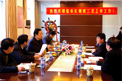 日前,南通市常務副市長藍紹敏率領(lǐng)市發(fā)改、經(jīng)貿(mào)等部門主要領(lǐng)導,到三圣公司調(diào)研上市工作,公司董事長馮圣君及部分高管陪同調(diào)研。