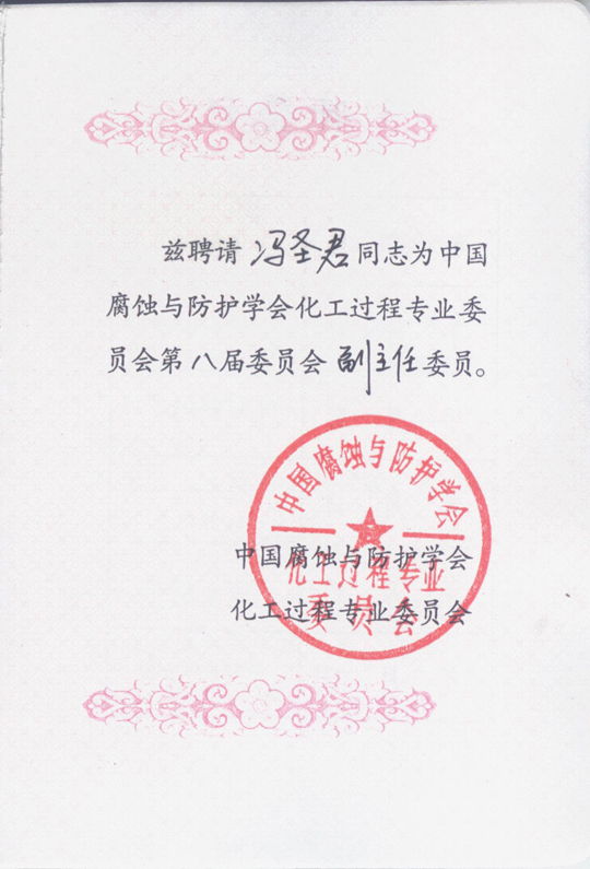鑒于馮圣君在中國腐蝕與防護領域的杰出貢獻與不懈追求,中國腐蝕與防護學會經(jīng)過認真考察,決定聘任其擔任化工過程專業(yè)委員會副主任,代表企業(yè)界參與學會工作。