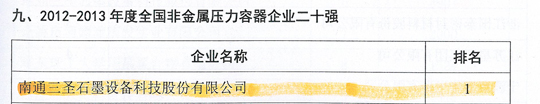 在剛剛閉幕的第五屆中國國際腐蝕控制大會上,南通三圣石墨設(shè)備科技股份有限公司憑借其優(yōu)異的業(yè)績榮登三大榜單,分別是:"2012-2013年度全國防腐蝕行業(yè)二十強企業(yè)"(排名第7位);"2012-2013年度全國非金屬壓力容器企業(yè)二十強"(排名第1位);"2012-2013年度全國防腐蝕行業(yè)外貿(mào)出口企業(yè)二十強"(排名第6位)。
